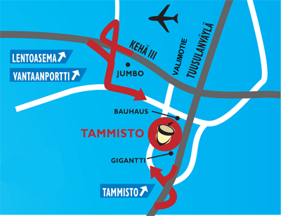 Ostospuisto Tammisto sijaitsee Vantaan Tammistossa, helposti saavutettavissa lentokentän suunnasta tultaessa. Löydät meidät Tammiston Kauppatien varrelta, heti Bauhausin jälkeen. Tunnistat meidät myös lentokentän suunnasta tultaessa Ostospuiston päädyssä olevasta suuresta LED-näytöstä.